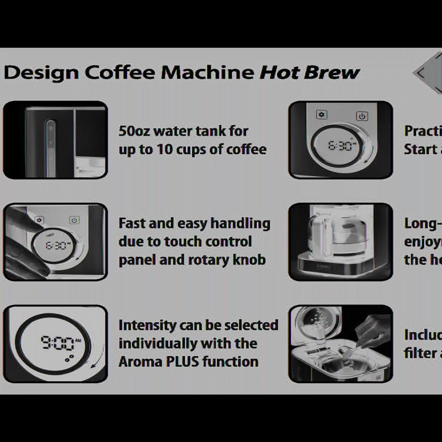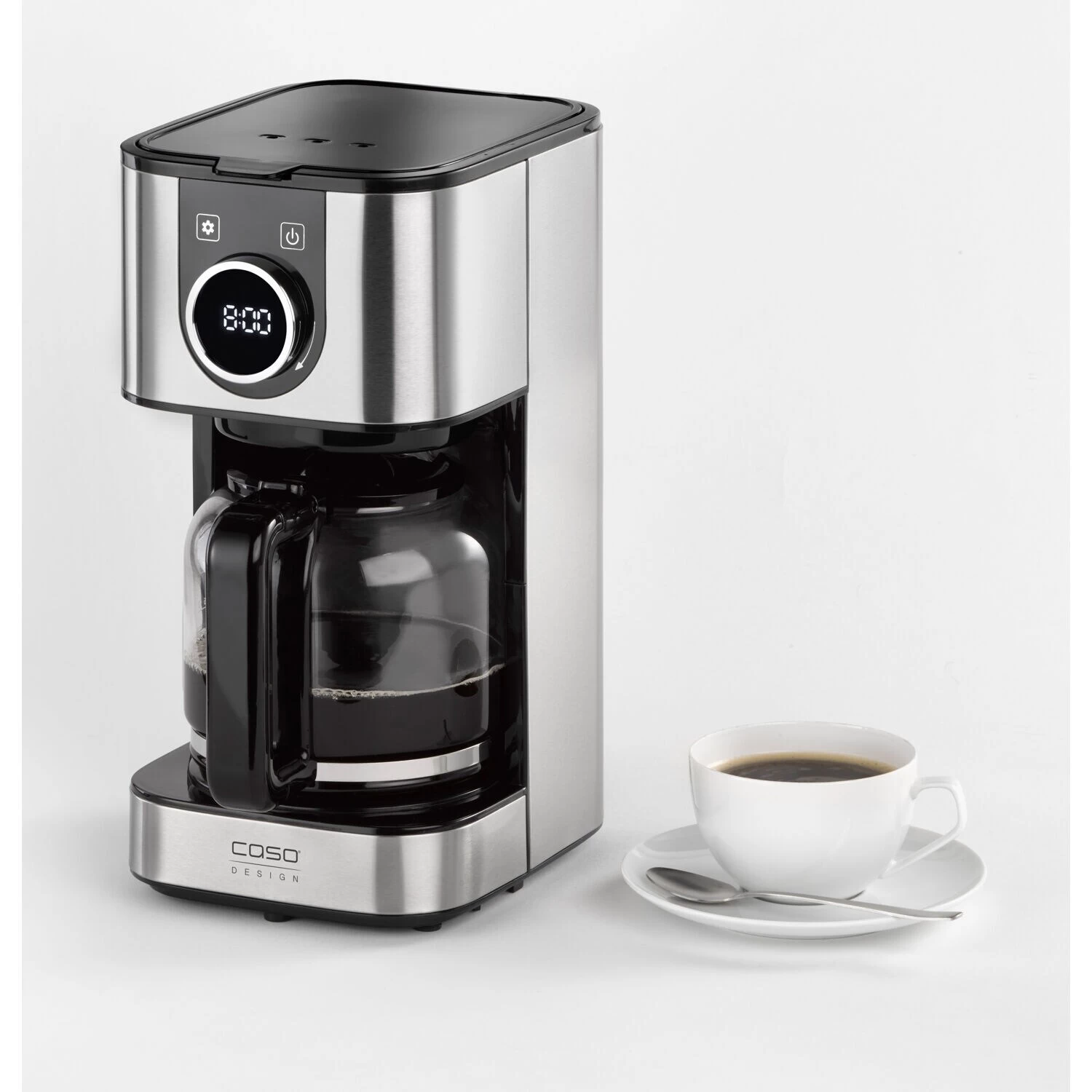 The Caso Hot Brew 10 cup drip coffee maker makes a great cup of hot coffee. The glass carafe keeps your coffee warm for 35 minutes. The easy to set programmable timer allows you to prepare coffee when you want it. Comes with a permanent removable filter that is easy to clean and saves you money and waste. The built in lid for the filter has 17 holes to evenly distribute the water over the coffee grounds to maximize taste.