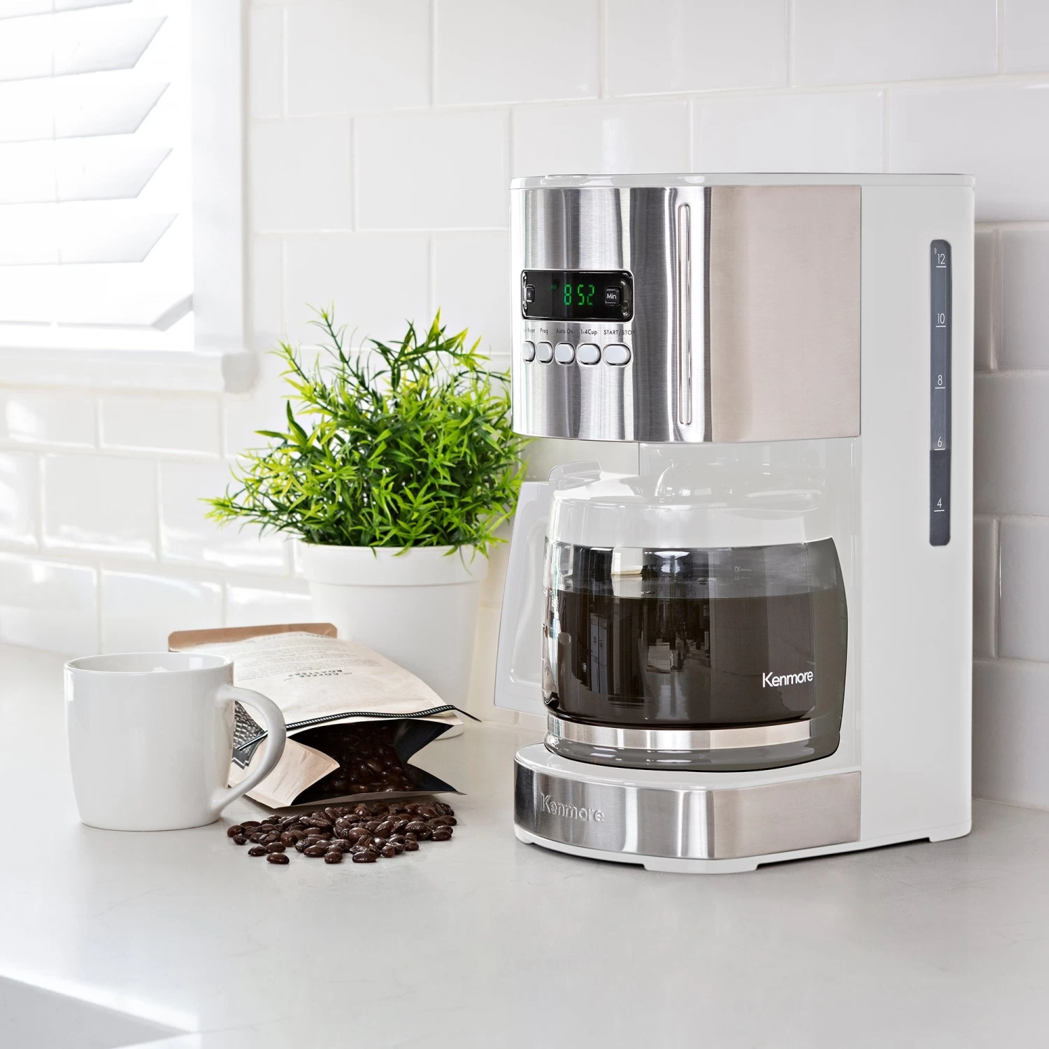 There’s nothing better in the world than that first sip of coffee in the morning, and with this programmable 12 cup coffee maker you won’t have to wait. Program the brewer the night before and wake up to the delicious aroma of perfectly brewed coffee or make a fresh, hot pot with the push of a button. The dishwasher-safe glass carafe holds up to 12 cups of brewed coffee and a non-stick warming plate keeps it hot and flavorful for hours. The attractive stainless steel profile with four color options will complement any decor and the narrow profile means more countertop space. With a charcoal filter to remove impurities from the water before brewing and state-of-the-art “aroma control” brewing technology that steeps the grounds before releasing the coffee into the carafe, you’ll definitely be waking up on the right side of the bed from now on. Best of all, Kenmore products are covered by a 2-year limited warranty for your peace of mind.