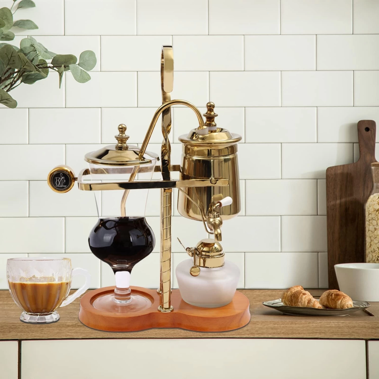 CLASSY PLATED: In classic gold ridged fulcrum with Tee handle, decorative holed balance lever and matching wooden board base. A real conversation starter and center of attraction for it exquisite design, brews in style and delicious coffee.