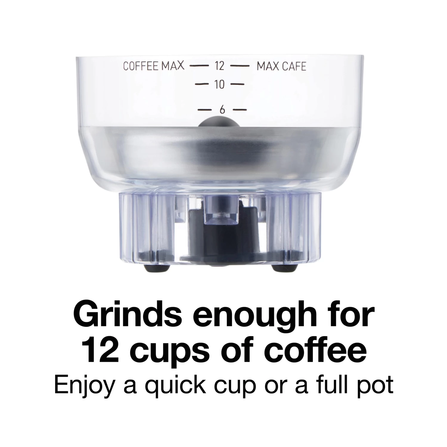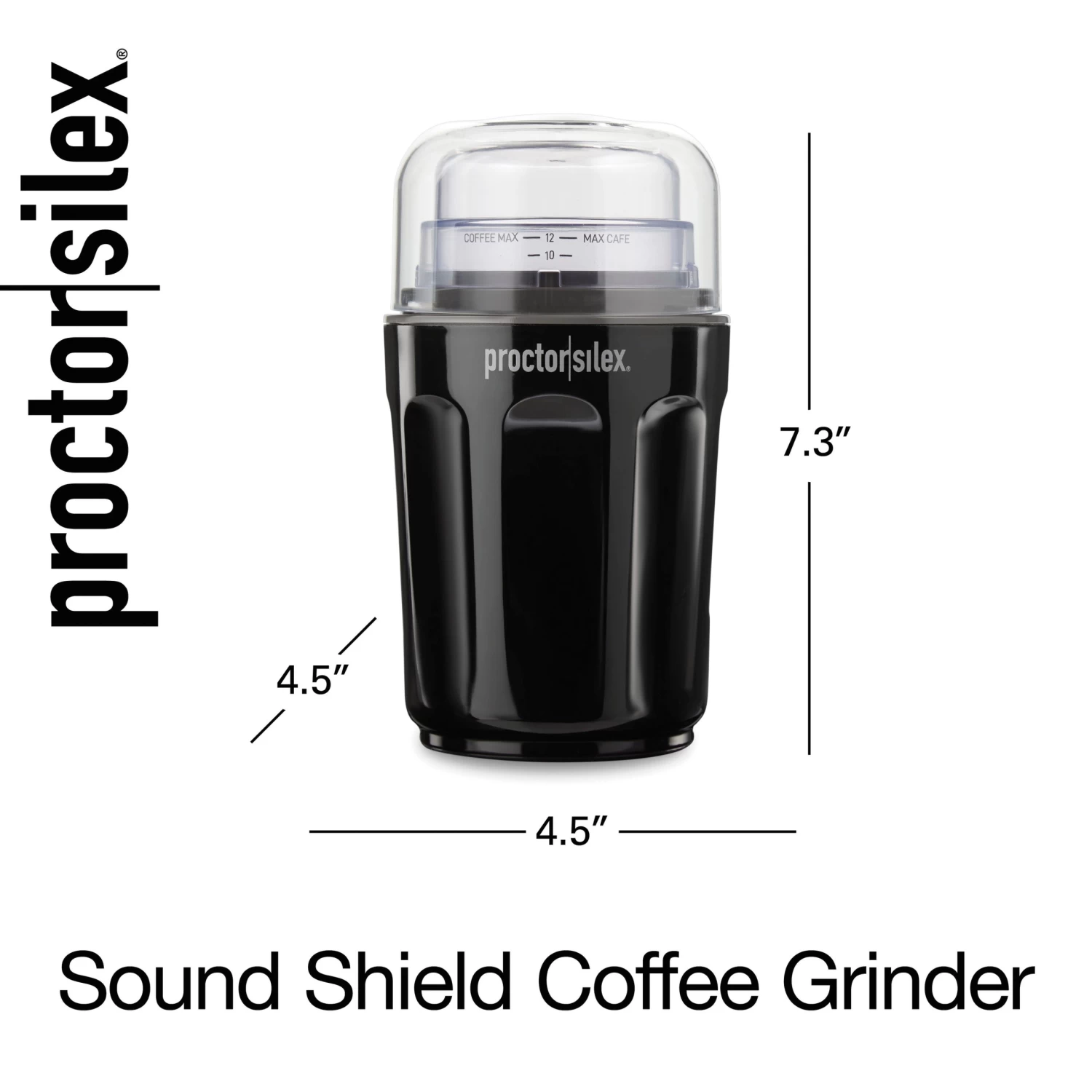 The Proctor Silex® Sound Shield Coffee Grinder is designed with Sound Shield technology to be 50% quieter* when grinding coffee. It’s perfect for anyone who loves delicious, freshly ground coffee without all the noise. Grind coffee quietly without waking the family and savor your peaceful mornings, or steal some “me” time with a fresh, flavorful cup of coffee anytime. Every day is a good day to enjoy fresh, great-tasting coffee in the quiet and comfort of your own home whether you want a quick cup or a full pot. The electric coffee bean grinder grinds enough coffee to brew up to 12 cups. It’s simple to use. Just press the outer lid to grind coffee and release to stop grinding. The grinding bowl easily removes to fill with coffee beans and makes it easy to pour coffee grounds after grinding. The grinding bowl is dishwasher safe for easy cleanup. The coffee grinder is built to last with durable stainless steel grinding blades and is backed by Proctor Silex with a 3 year limited warranty. The hidden cord storage keeps excess cord off the countertop and holds the cord neatly in place when storing the grinder.