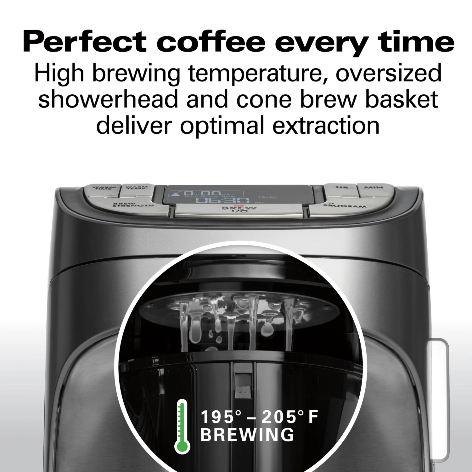 Enjoy rich, balanced coffee flavor in every cup. The high brewing temperature, oversized showerhead and cone brew basket are designed to evenly saturate coffee and provide optimal extraction