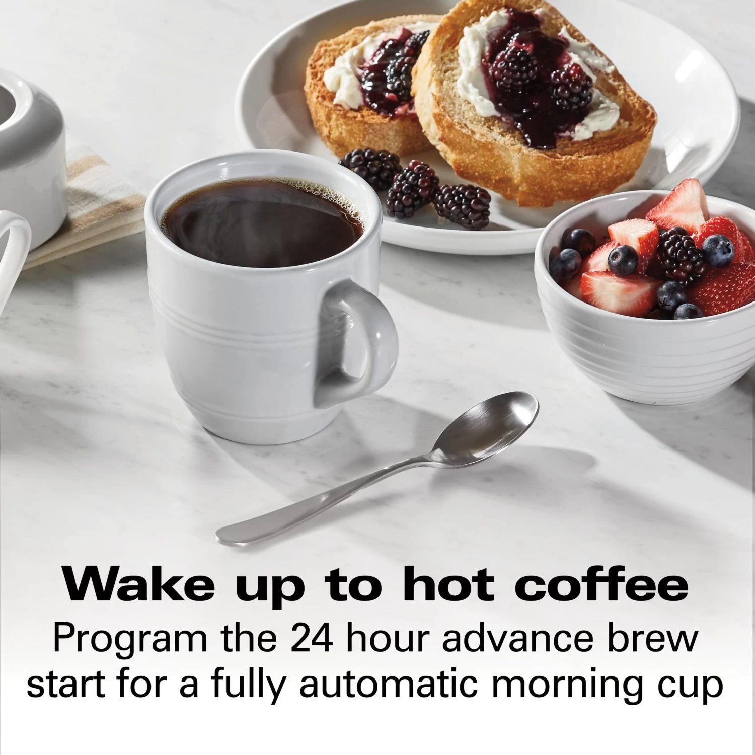This programmable coffee maker lets you start every day with fresh, hot coffee. Program the 24 hour advance brew start for a fully automatic morning cup