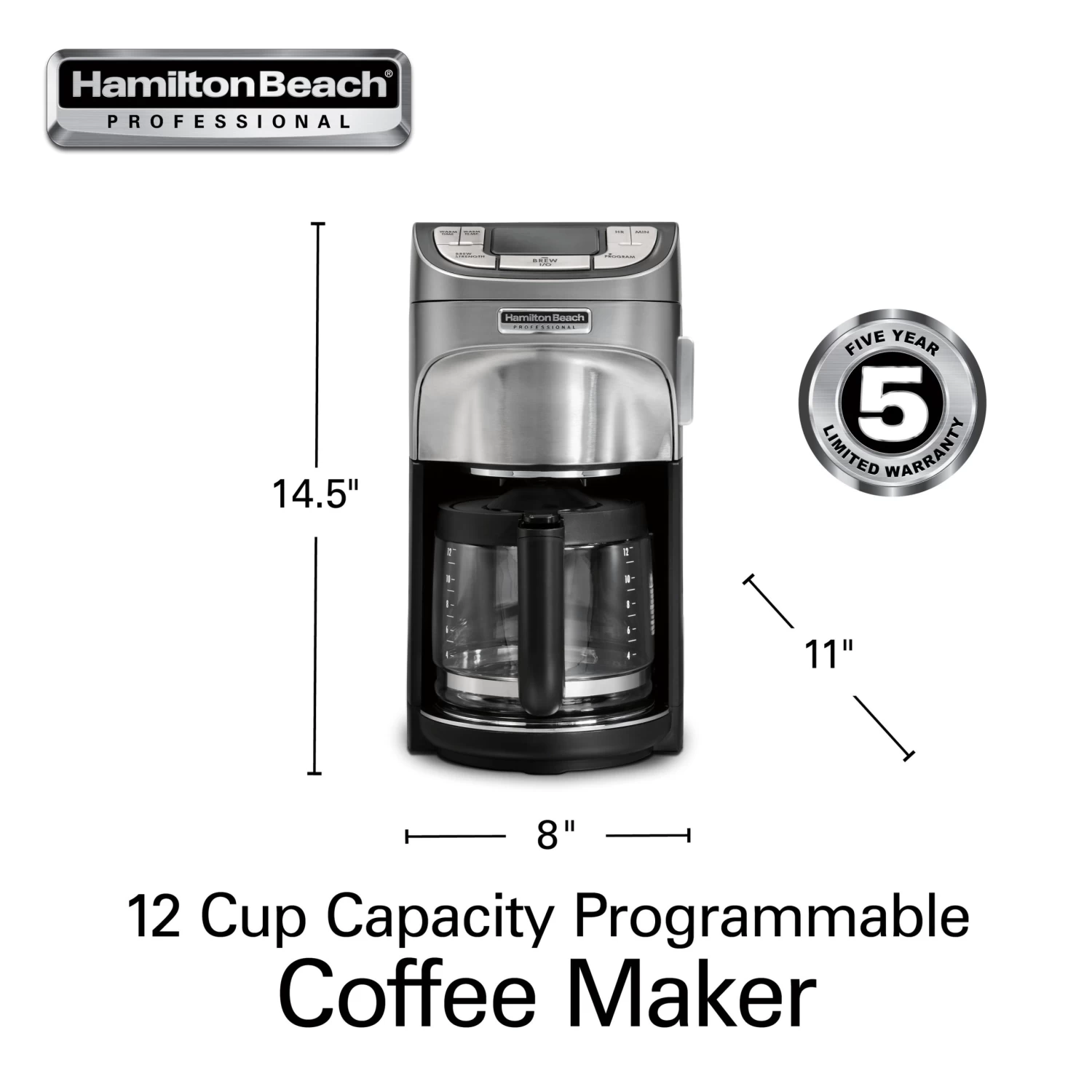 Enjoy perfect coffee every time with the Professional Programmable Coffee Maker. It has high-performance brewing to fully extract coffee’s rich, balanced flavor. The high brewing temperature, oversized showerhead and cone brew basket evenly saturate coffee and provide optimal extraction. The removable 60 oz. water reservoir and swing-open cone brew basket make filling easy. You can wake up to hot coffee with the 24 hour advance brew start, which lets you program a fully automatic morning cup. The drip-free carafe with ergonomic handle provides comfortable, mess-free pouring. You can customize your coffee with 4 brew strength options and the adjustable keep warm temperature. The “time since brew” freshness indicator and cleaning cycle reminder help you consistently achieve fresh-tasting coffee, and the auto shutoff time is adjustable. The sleek, brushed-metal design of this coffee maker looks great in every kitchen. Accessories include a coffee scoop, water filter and starter kit of #4 cone filters.