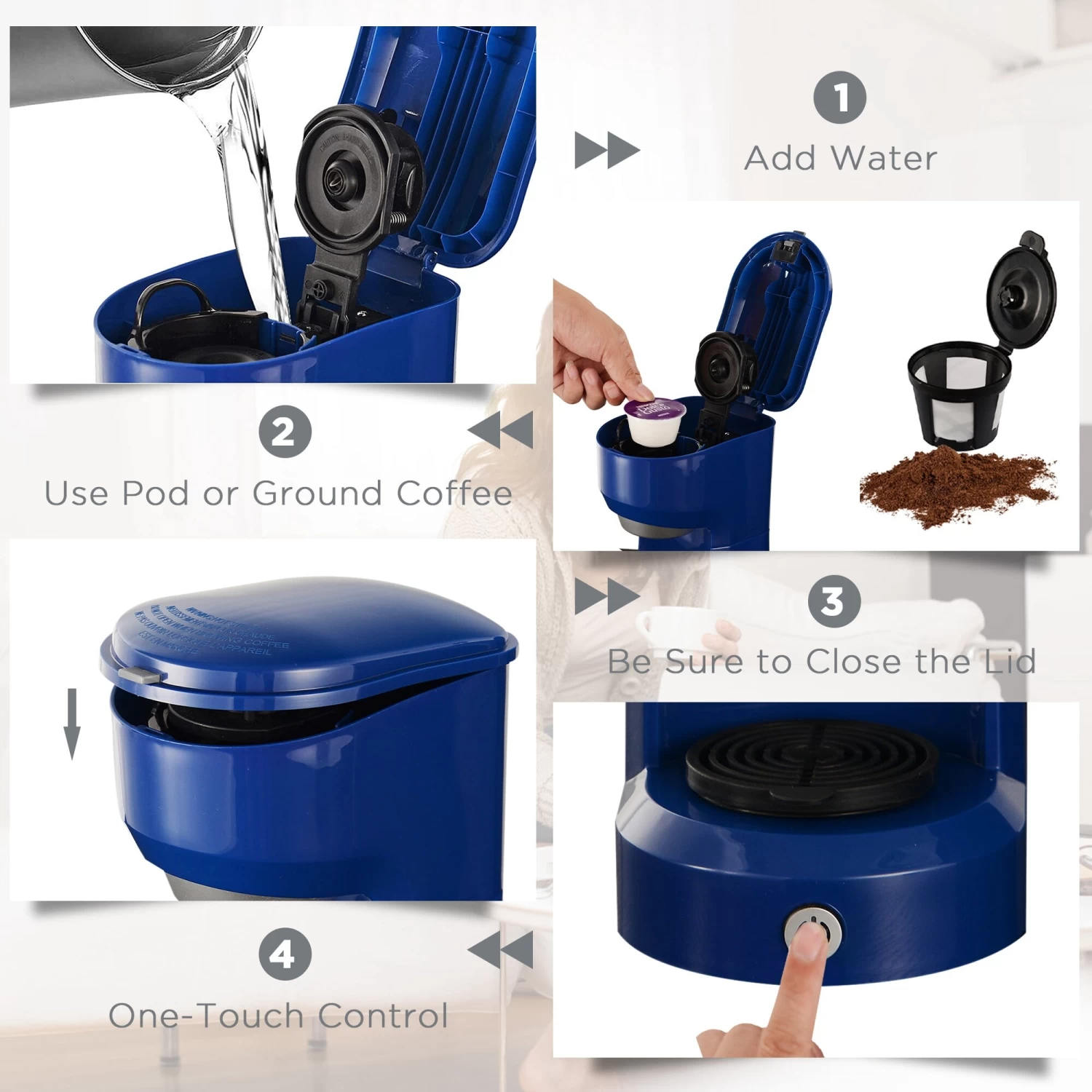 Over time, investing in a coffee machine for home use can save you money compared to buying coffee from coffee shops. In just two minutes, a steaming cup of fresh coffee is ready for you. If you like iced coffee, then all you need to do is add ice cubes to your coffee for a refreshing iced coffee! With a coffee machine at home, you can customize your coffee to your liking. You can adjust the strength, amount of milk, and sweetness of your coffee, among other factors, to suit your taste preferences.Imagine your coffee maker and breakfast machine working for you at the same time as you exercise in the morning. When you finish exercising, you can enjoy a delicious breakfast. With one touch button and light instruction, you can make a cup of coffee easily and quickly. After brewing, the Single-Serve Coffee Maker will auto shut-off, which ensure safety. Cleaning your machine have never been this easy! Detachable filter basket and drip tray can be washed directly. For cleaning, just add water and press button.